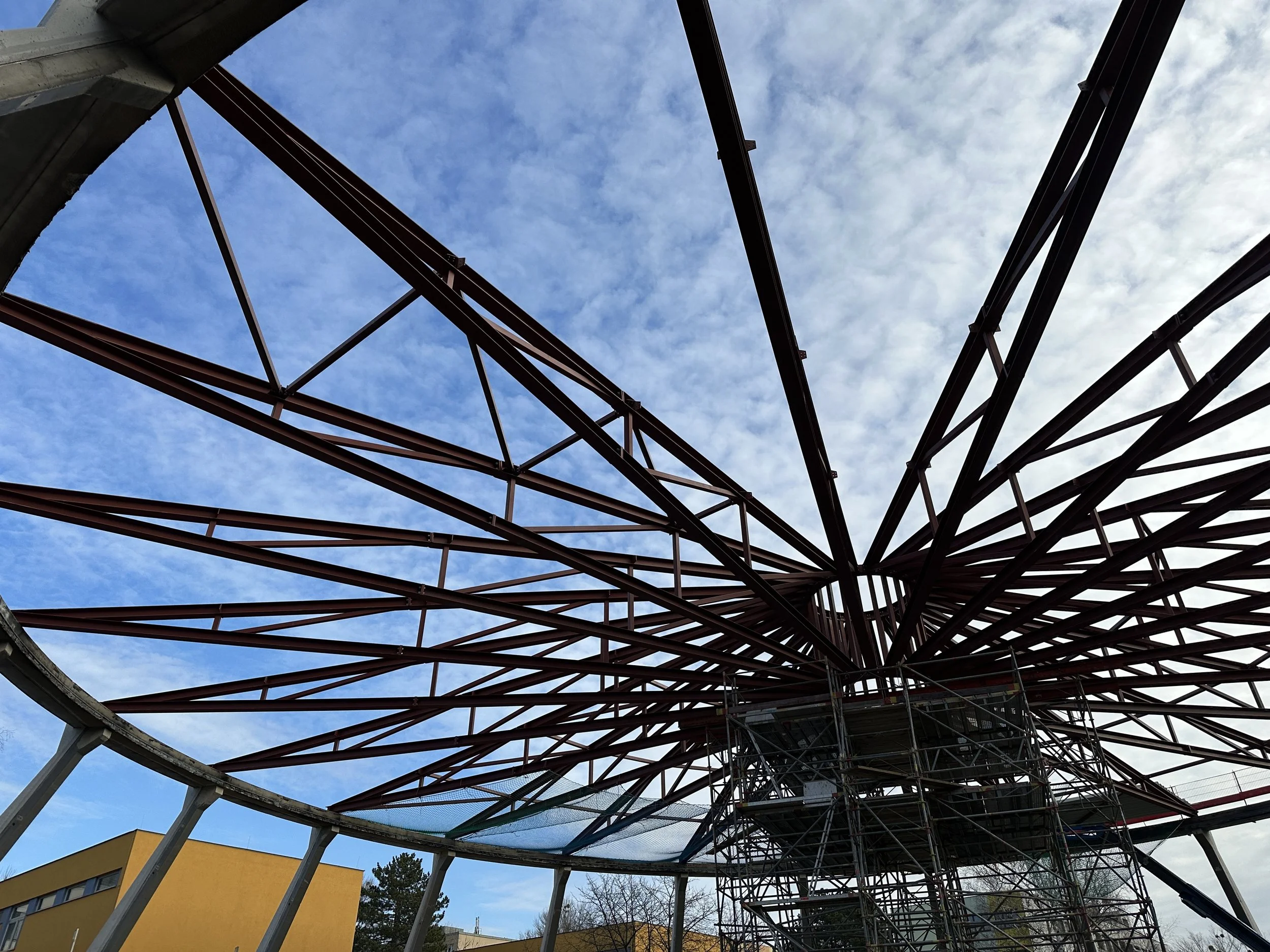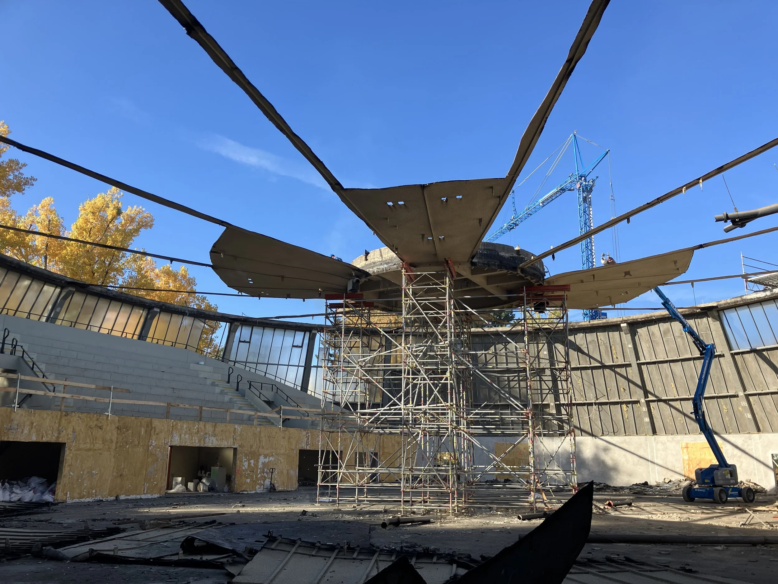 Im Zuge der Generalsanierung, wurde ein komplett neuer Dachaufbau mit positiver Neigung installiert – jetzt steigt das Dach nach außen an, der innere Druckring liegt an der höchsten Stelle, und die Halle gewinnt über 9 Meter lichte Höhe.